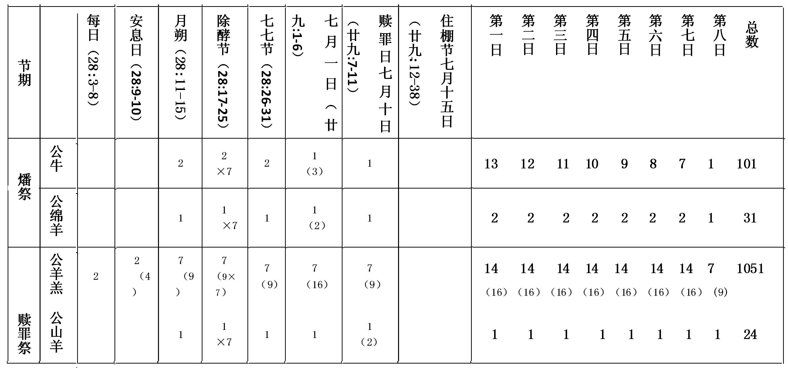 记载,列出的节期亦与利未记23章相同。虽有一些重复之处,但重点各有不同。本段是给予祭司的指示,特别著重各项祭物的数量;利未